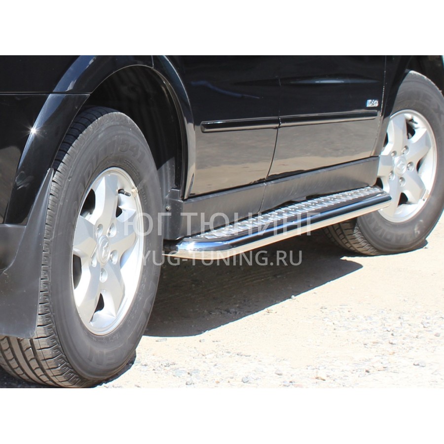 Пороги выполнены из нержавеющей трубы AISI 304 d-53x1,5 mm с алюминиевым листом. Устанавливаются изделия в штатные места автомобиля, все необходимые для установки данной детали крепежные элементы и инструкция входит в комплект. Благодаря порогам посадка-высадка в автомобиль будет гораздо комфортней. Рифлёная алюминиевая площадка весьма удобна и практична за счет легкости листа, отсутствия скольжения при передвижении (даже в зимний период). Все производимые компанией «Технотек» изделия имеют сертификаты соответствия.