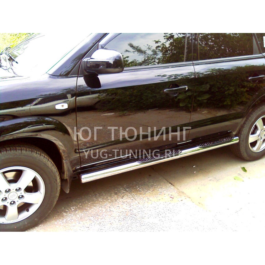 Пороги выполнены из нержавеющей трубы AISI 304 d-76x1,5 mm с пластиковыми площадками (степами). Устанавливаются изделия в штатные места автомобиля, все необходимые для установки данной детали крепежные элементы и инструкция входит в комплект. Благодаря порогам посадка-высадка в автомобиль будет гораздо комфортней. Все производимые компанией «Технотек» изделия имеют сертификаты соответствия.