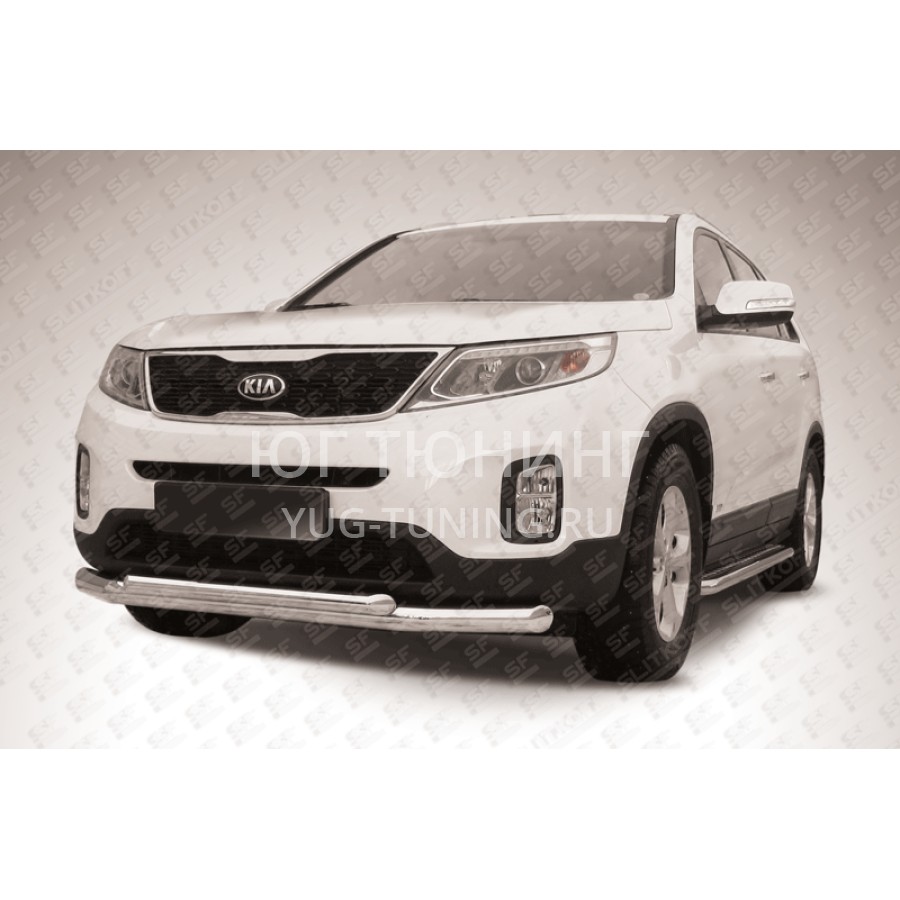 При изготовлении товара: Защита переднего бампера d76+d57 двойная KIA Sorento (2013) используются передовые технологии и качественные материалы. Данный товар KS13-001 комплектуется комплектом переходных кронштейнов и необходимым количеством болтов, гаек и шайб для его установки. Также в комплекте поставляется понятная инструкция по установке и рекомендации по уходу за изделием.