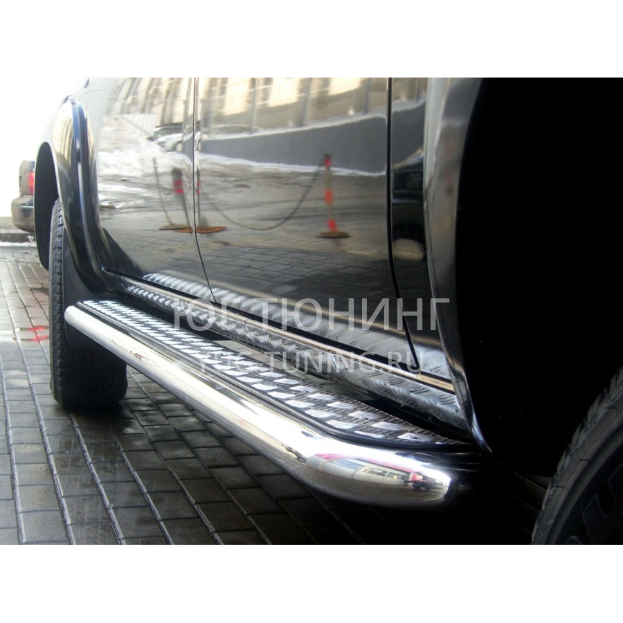 Пороги выполнены из нержавеющей трубы AISI 304 d-60x1,5 mm с алюминиевым листом. Устанавливаются изделия в штатные места автомобиля, все необходимые для установки данной детали крепежные элементы и инструкция входит в комплект. Благодаря порогам посадка-высадка в автомобиль будет гораздо комфортней. Рифлёная алюминиевая площадка весьма удобна и практична за счет легкости листа, отсутствия скольжения при передвижении (даже в зимний период). Все производимые компанией «Технотек» изделия имеют сертификаты соответствия.