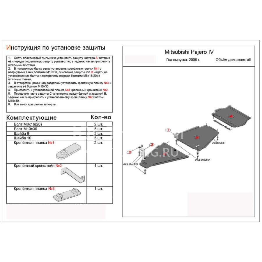 Защита картера двигателя и кпп Mitsubishi Pajero (Митсубиши Паджеро) IV (V-3,0; 2006-)+РК из 3-х частей (Сталь 2 мм)( Митсубиси Митсубиши Паджеро 4 )