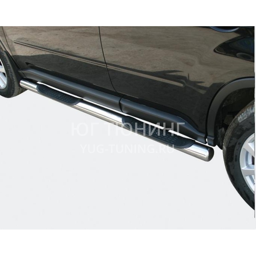 Пороги выполнены из нержавеющей трубы AISI 304 d-76x1,5 mm с пластиковыми площадками (степами). Устанавливаются изделия в штатные места автомобиля, все необходимые для установки данной детали крепежные элементы и инструкция входит в комплект. Благодаря порогам посадка-высадка в автомобиль будет гораздо комфортней. Все производимые компанией «Технотек» изделия имеют сертификаты соответствия.