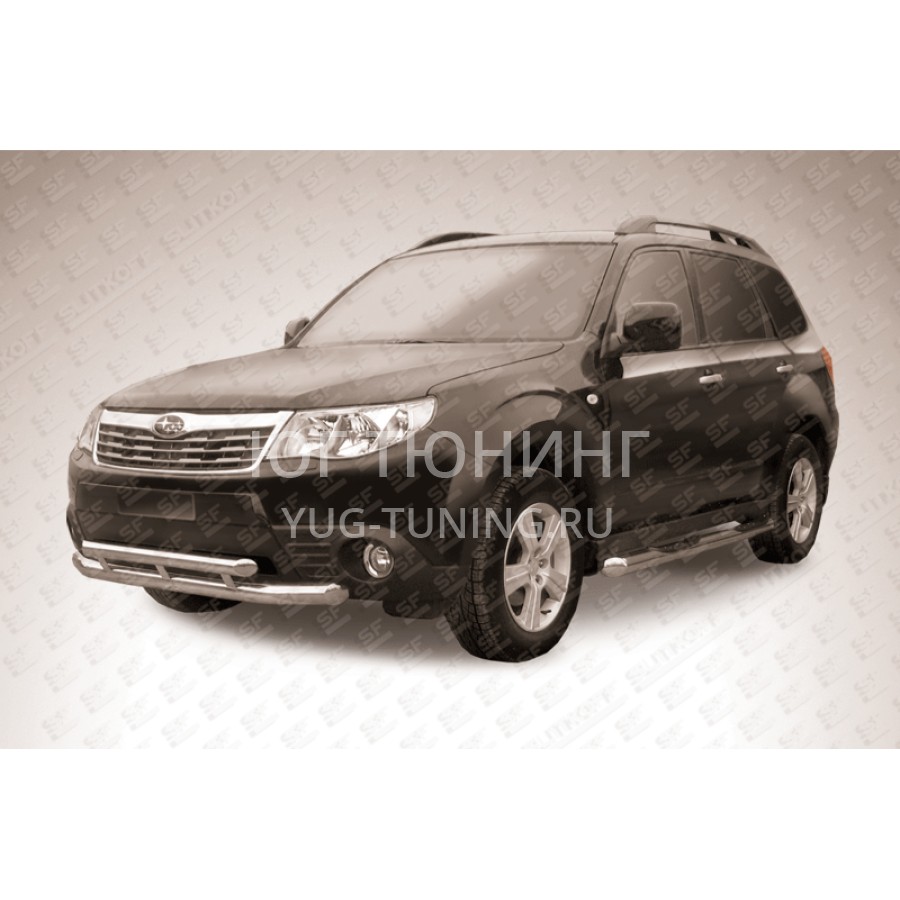 При изготовлении товара: Защита переднего бампера d57+d57 двойная Subaru Forester используются передовые технологии и качественные материалы. Данный товар SF011 комплектуется комплектом переходных кронштейнов и необходимым количеством болтов, гаек и шайб для его установки. Также в комплекте поставляется понятная инструкция по установке и рекомендации по уходу за изделием.