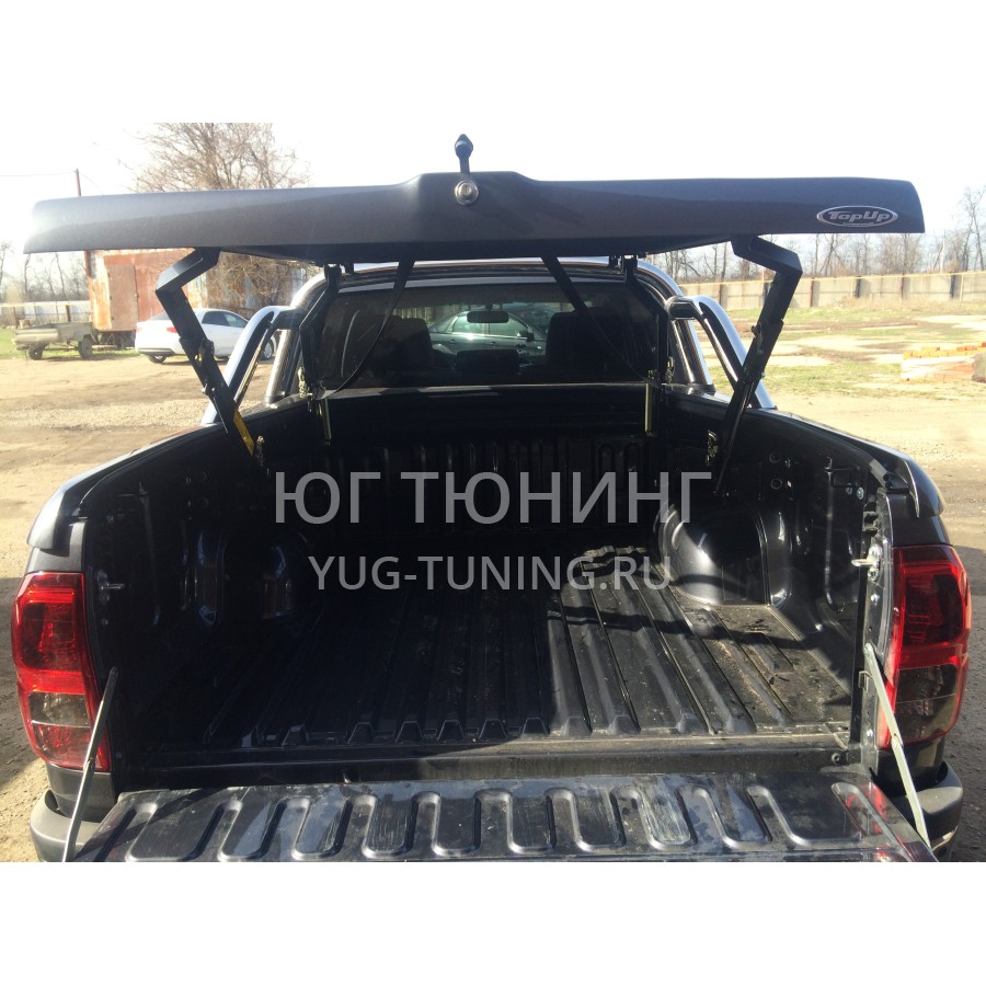Крышка из стеклопластика окрашенная в цвет с дугой из 2-х нержавеющих труб диаметром 76 мм с замком, с механизмом открывания в 2-х положениях, первое положение - под 45 градусов, второе положение - вверх параллельно кузову и фиксируется с помощью скобы, в таком положении возможно перевозить различные грузы. Установка 5000