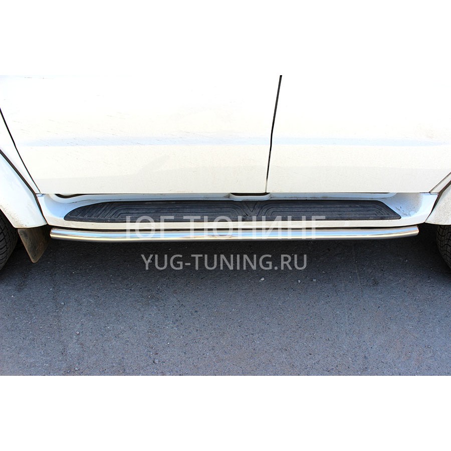 Обводы штатного порога выполнены из нержавеющей трубы AISI 304 d-53x1,5 mm. Устанавливаются изделия в штатные места автомобиля, все необходимые для установки данной детали крепежные элементы и инструкция входит в комплект. Обводы штатного порога не только украшают автомобиль, но и носят защитную функцию. Все производимые компанией «Технотек» изделия имеют сертификаты соответствия.