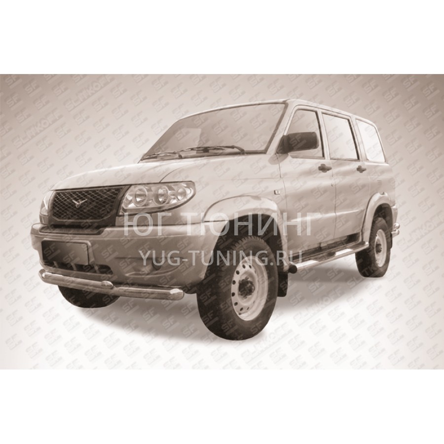 При изготовлении товара: Защита переднего бампера d76+d57 UAZ Patriot используются передовые технологии и качественные материалы. Данный товар UP003 комплектуется комплектом переходных кронштейнов и необходимым количеством болтов, гаек и шайб для его установки. Также в комплекте поставляется понятная инструкция по установке и рекомендации по уходу за изделием.